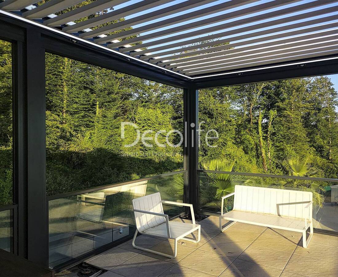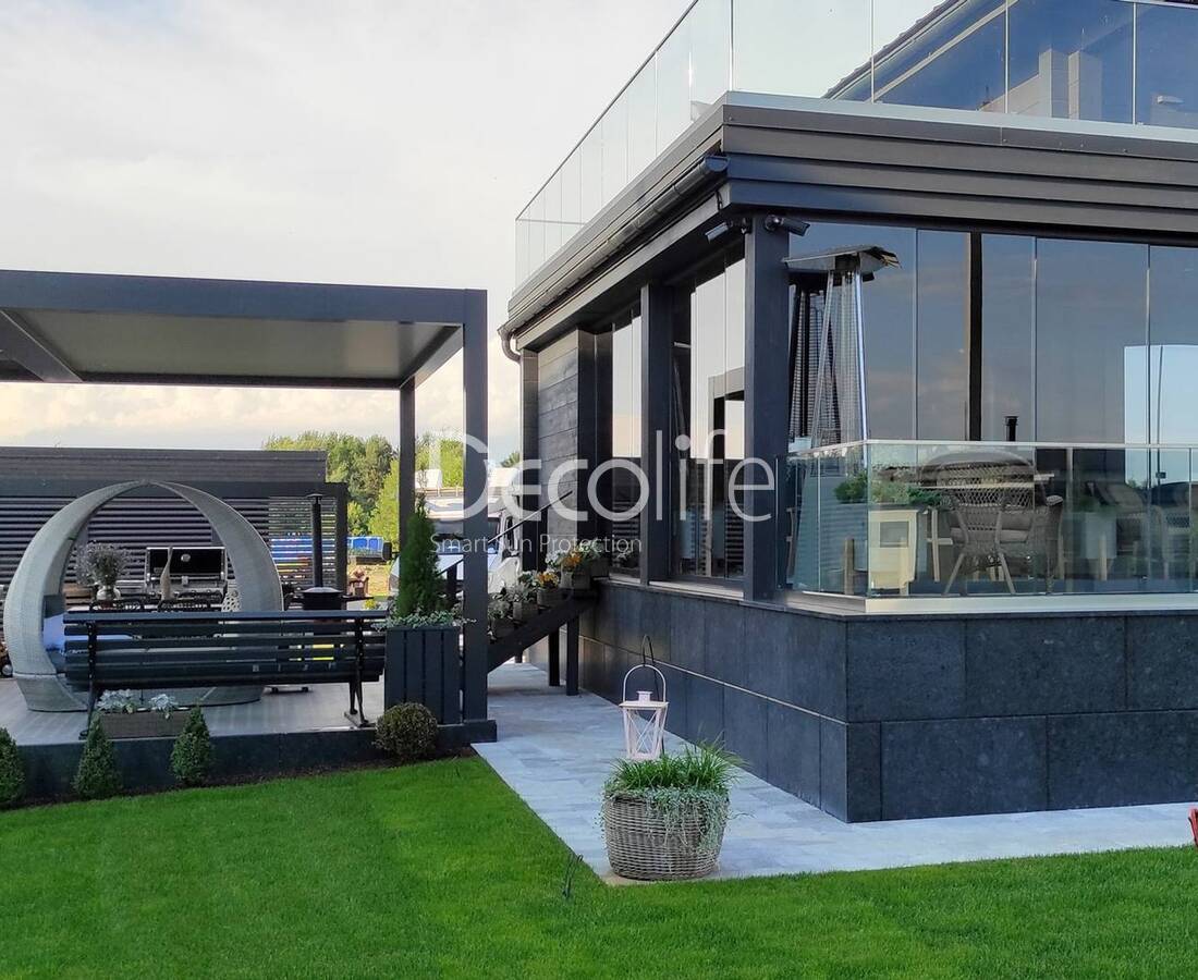 Раздвижная конструкция обеспечивает удобство использования и отличную теплоизоляцию. Такие системы можно использовать для остекления всех пергол Decolife. Конструкции выглядят благородно и оригинально.
